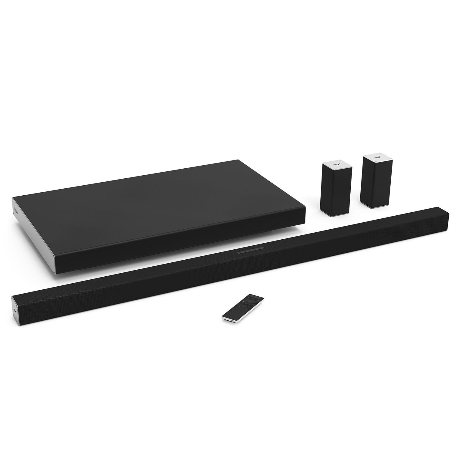 Image: The VIZIO SB4551-D5 soundbar, wireless subwoofer, and two satellite speakers included in the system.