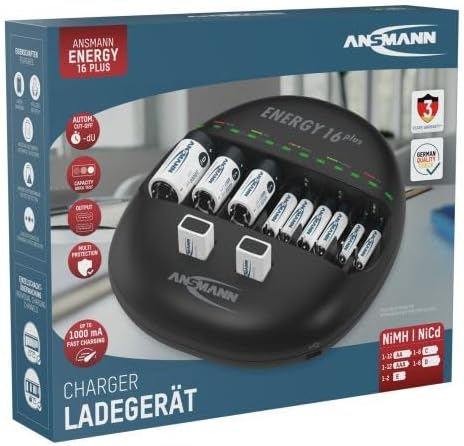 Image: The ANSMANN Energy 16 Plus charger, displaying its multiple charging slots for different battery sizes, including AA, C, D, and 9V batteries.