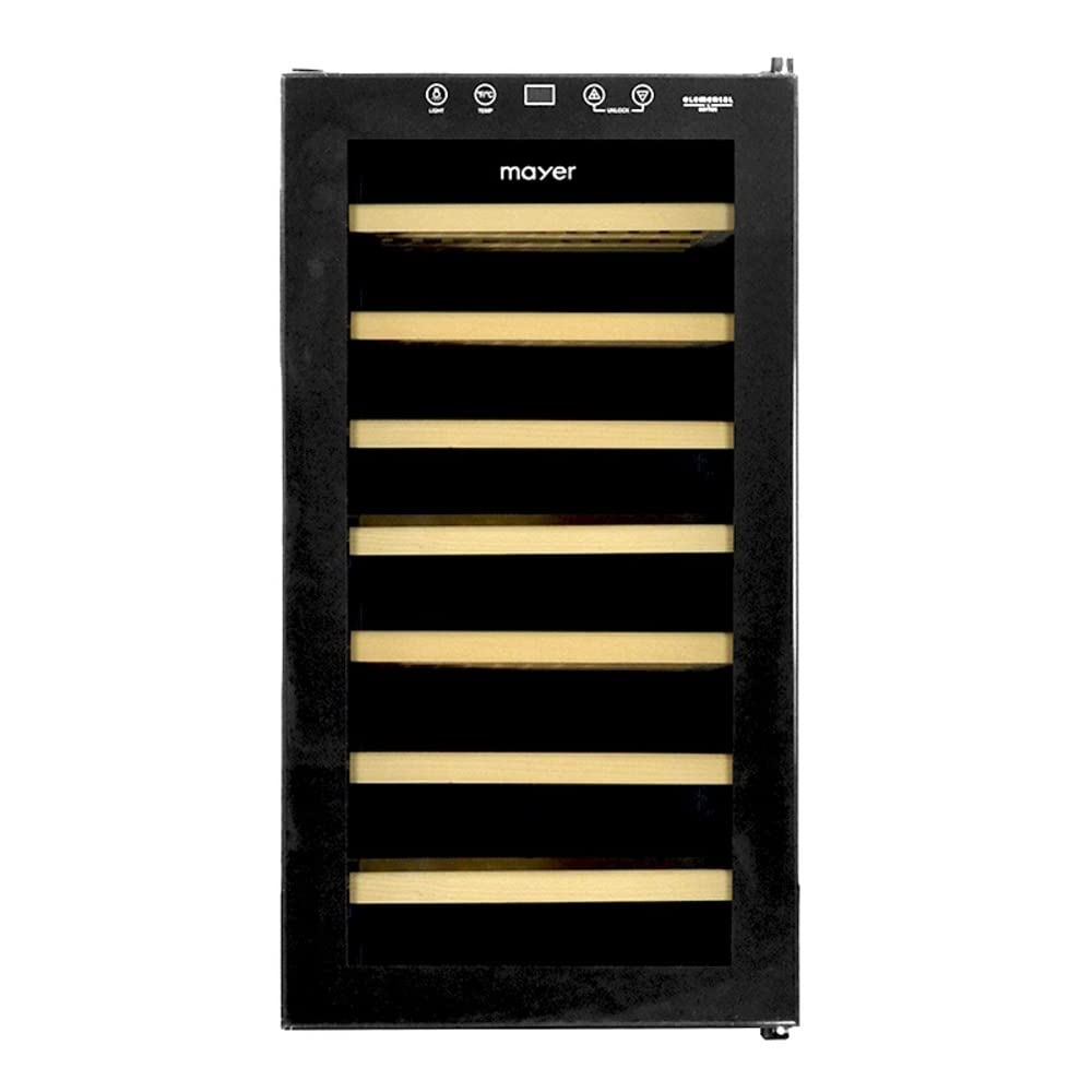 The Mayer MMWC28MAGWD can accommodate up to 28 standard Bordeaux 750ml bottles. It is equipped with wooden racks for secure storage.