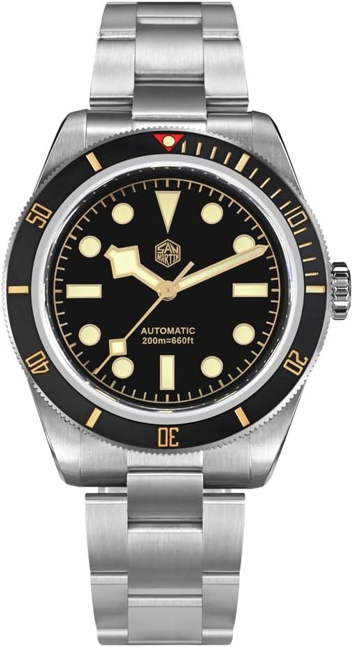 The San Martin SN004 V2 is a 38mm automatic mechanical watch, built with a 316L stainless steel case and a sapphire crystal with anti-reflective coating. It features a 120-click unidirectional ceramic bezel and Super Luminous BGW9 blue light on its hands and hour markers for visibility in low light conditions.